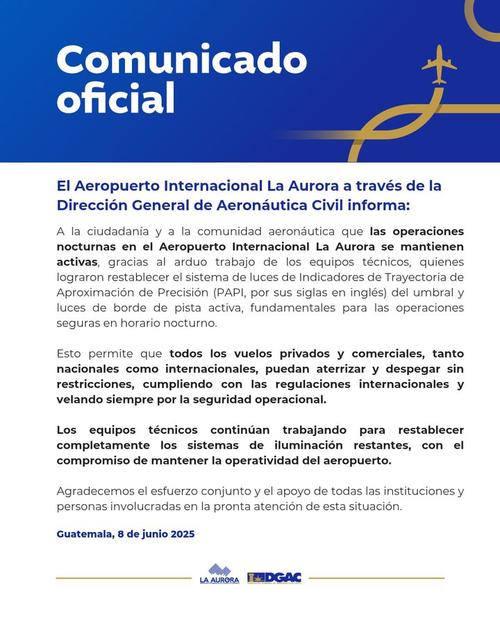 Las luces de la pista del Aeropuerto Internacional La Aurora ya están en funcionamiento y las operaciones nocturnas en esa terminal aérea están activas, informó la Dirección General de Aeronáutica Civil, mediante un comunicado.