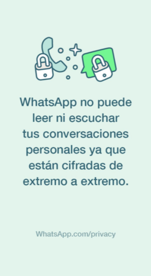 Mientras que la segunda menciona: “WhatsApp no puede leer ni escuchar tus conversaciones personales ya que están cifradas de extremo a extremo”.