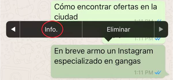 Para ver las confirmaciones de lectura en los chat grupales en un dispositivo con sistema operativo Android, únicamente es necesario presionar sobre el mensaje y elegir la opción "Info".