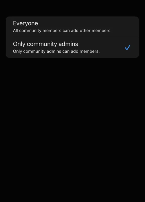 La finalidad de la herramienta será diferenciar entre las opciones "Todos", que indica que cualquier integrante de la comunidad admita el ingreso de otros miembros, y "Solo administradores de la comunidad", que le brindará la posibilidad a quienes estén encargados de moderar las interacciones dentro de los chats.