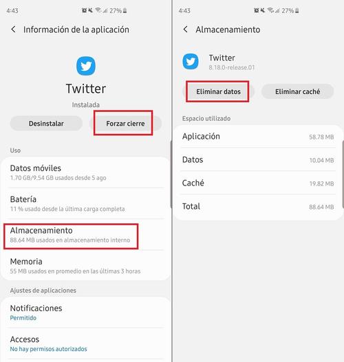 Se ha comprobado que algunos usuarios, pese a descargar la última actualización, no pueden activar el modo oscuro. Para conseguirlo, es necesario seguir al pie de la letra una serie de pasos: Ajustes > Aplicaciones > Twitter > Forzar cierre. Luego, en el apartado Almacenamiento se selecciona Eliminar Datos.
