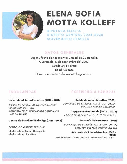 Motta tiene 23 años y, de acuerdo con el currículo que acompaña su perfil en el sitio web del Congreso, cerró pénsum en la Licenciatura en Ciencia Política, por la Universidad Rafael Landívar.