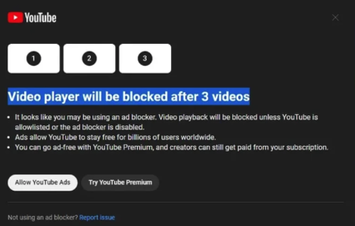 Sin embargo, usuarios de Reddit fueron los que dieron a conocer esta nueva función que consiste en que se visualizará una nueva pantalla si se está utilizando un bloqueador de anuncios en YouTube, y a la vez, el usuario recibe una advertencia de que podrá ser bloqueado después de reproducir tres vídeos si sigue sin desactivar el bloqueador.