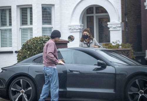 Ambos caminaron algunos metros antes de salir a toda velocidad en el automóvil deportivo Porsche Taycan eléctrico del actor.