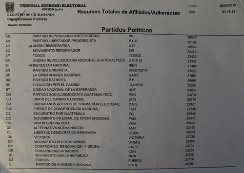 Este es el documento en el que se consigna el número de afiliados de cada uno de los partidos políticos que ha emitido el Tribunal Supremo Electoral. (Foto: Soy502)
