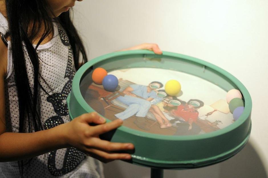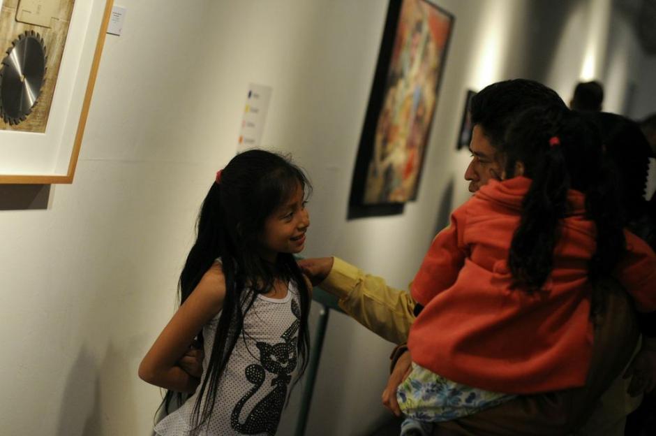 Una niña disfruta de las obras mientras comenta con su padre el significado de las piezas.